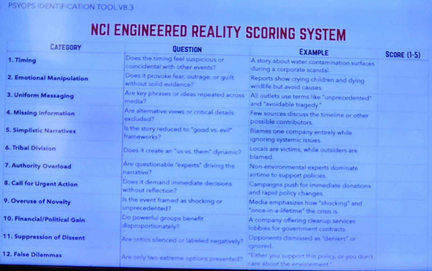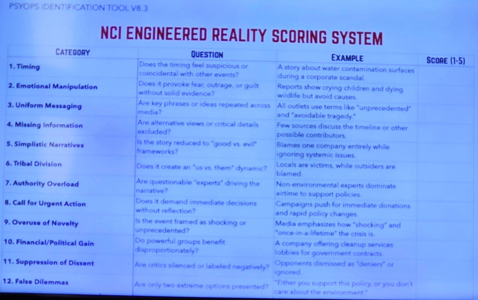 Dan: That image is the NCI Engineered Reality Scoring System — the exact 20-point psyops identification tool you’ve been asking me to use.